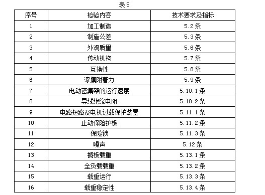之二。型式檢驗(yàn)的項(xiàng)目,手動(dòng)密集架按表5中序號(hào)1~6、13~16的內(nèi)容進(jìn)行,電動(dòng)密集架按表5中所列全部?jī)?nèi)容進(jìn)行。